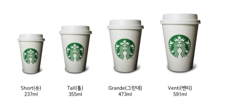 스타벅스 일회용 종이컵의 용량도 알아볼까요? 스타벅스는 4가지 용량으로 판매를 하는데요. 숏은 8온스(oz) 237ml, 톨은 12온스(oz) 355ml, 그란데는 16온스(oz) 473ml, 벤티는 24온스(oz) 591ml입니다.