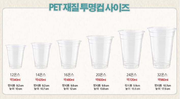 다음은 아이스 커피의 일회용컵(PET)의 용량을 알아볼께요. 아이스커피용 컵도 여러 종류가있는데요. 따뜻한 음료와는 달리 얼음이 들어가기때문에 기본 용량은 12온스(oz)부터 시작해서 14온스(oz), 16온스(oz), 20온스(oz), 24온스(oz), 32온스(oz)도 판매를 하네요. 1리터 커피가 32온스 컵을 사용했군요ㅎㅎ