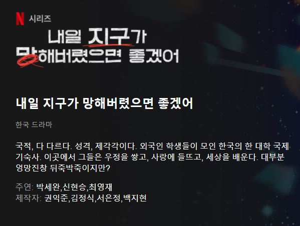 넷플릭스(Netflix)의 첫 국내 시트콤, 내일 지구가 망해버렸으면 좋겠어(지구망) 공개일, 박세완, 신현승, 영재, 민니, 한현민, 논스톱, 거침없이 하이킥 제작진이 만든 시트콤