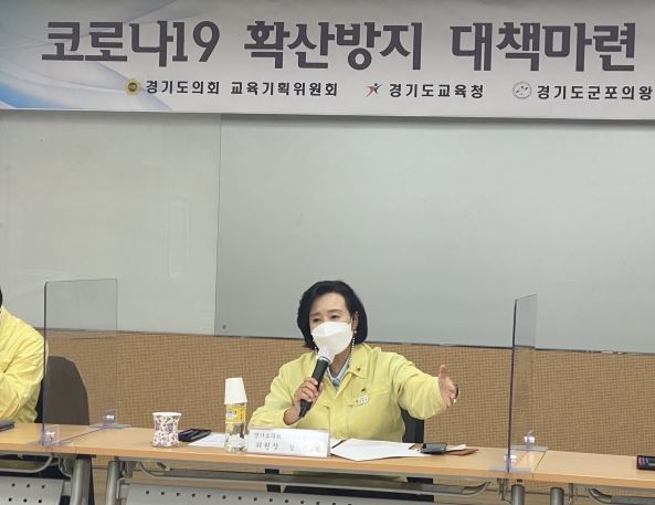 군포시 외국어 어학원 집단감염으로 인해 경기도의회 정윤경 위원장은 코로나19 시대가 장기간 이어지게 되면서 감염에 대한 사회적 인식이 점차 무뎌지는것에 대해 우려를 나타내면서 “모두가 긴장감을 늦추어서는 안된다”며 ‘경기도 교육청이 학원들의 지도 점검 뿐 아니라 코로나19 상황을 함께 헤쳐 나갈 수 있도록 적극적 지원과 함께 관심을 보여야 하며, 학원 내 방역사각지대 최소화를 위해 학원장들과 협회차원에서 해당 구성원들에 대한 적극적인 홍보와 협조’를 요청했습니다.